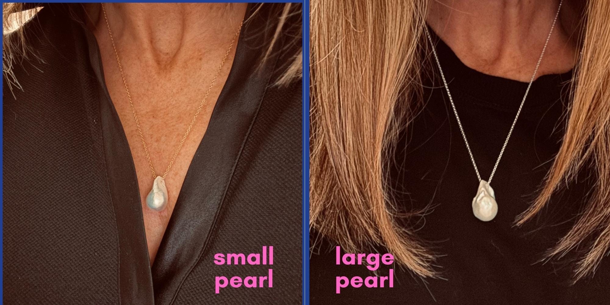 The pearls come in two sizes -- large (25-30mm x 15-20mm) and medium (18-20mm x 13-15mm long). They're on a 20-inch chain, and can be worn alone or layered. The single image of the sterling silver necklace with V-neck is the small size.