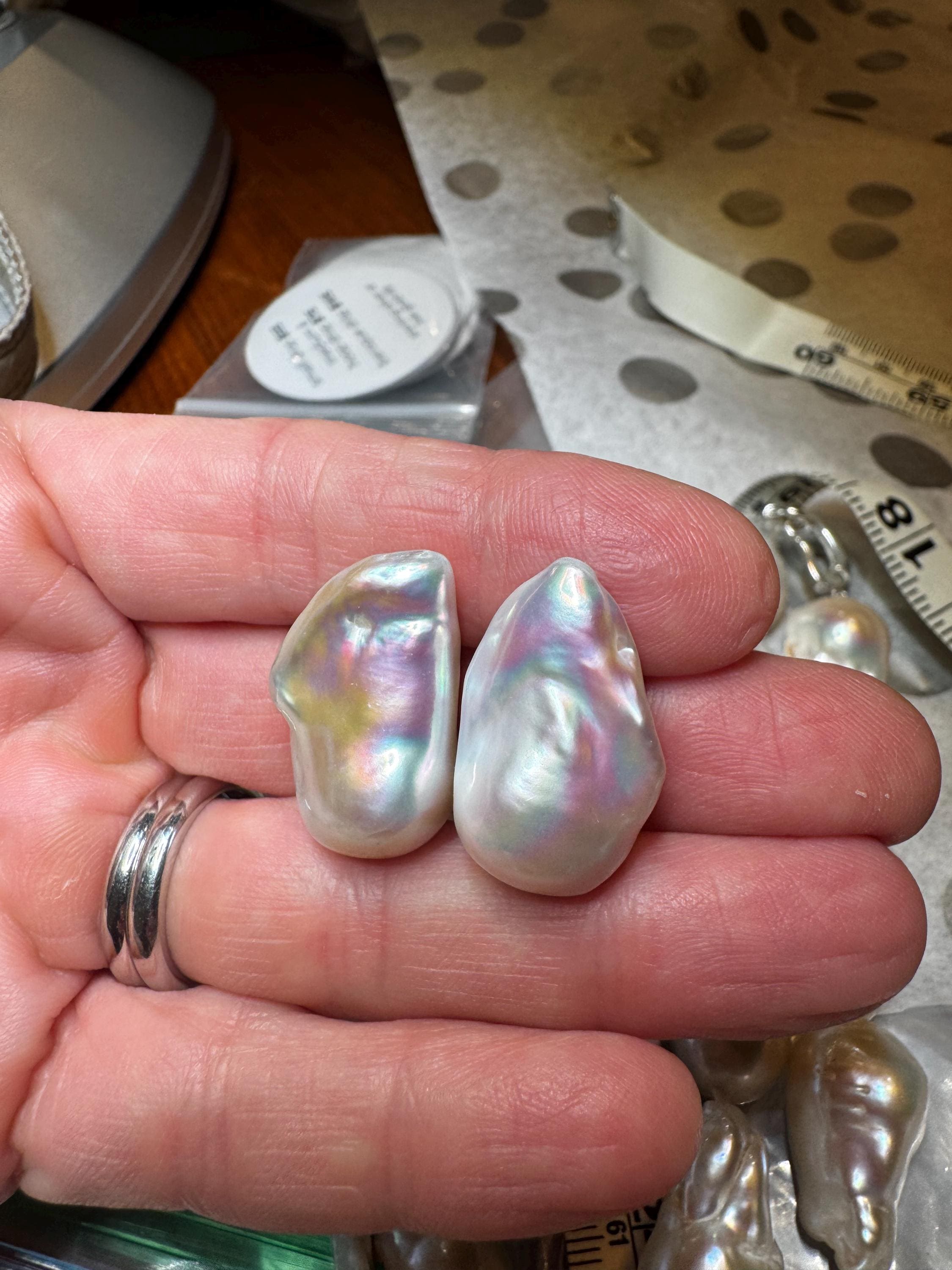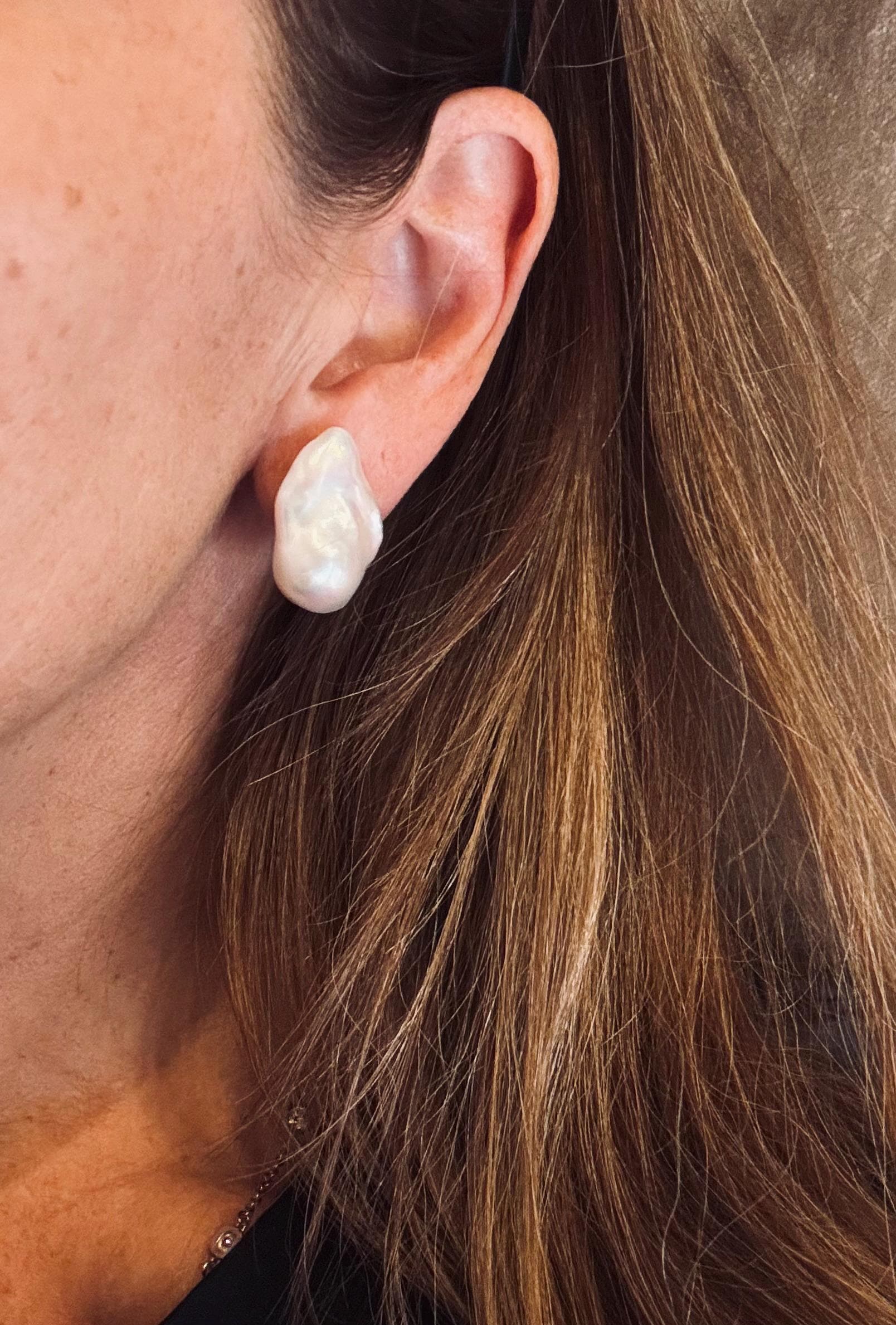 This category of studs is the largest and highest grade we sell. This pair is 26mm x 17mm. The posts are sterling silver, and they come with earring lifters (shown above). These prop up large studs beautifully on the lobe. This pair has a fabulous iridescence which is unmistakably white, but almost reflects hints of colour.
