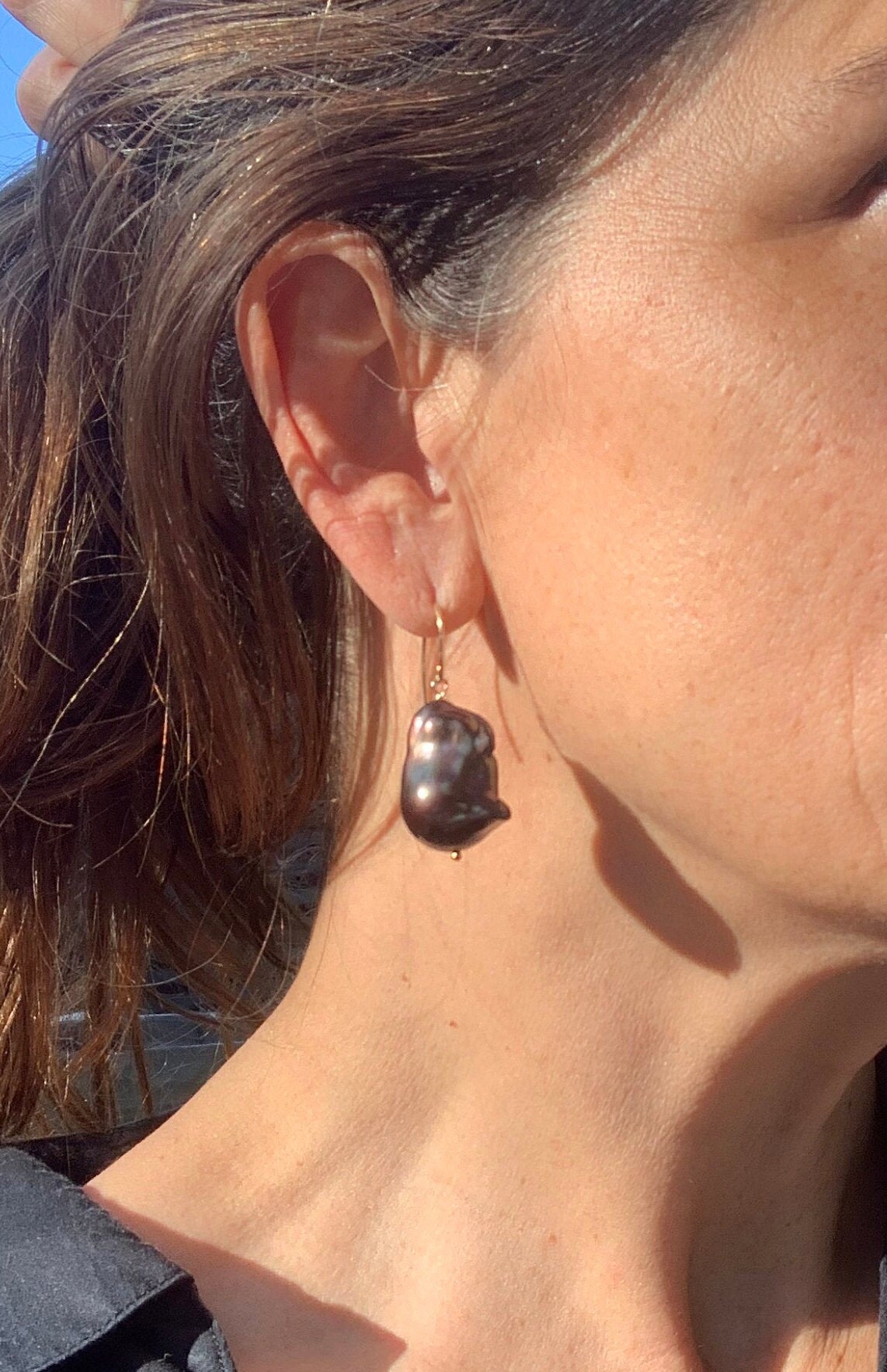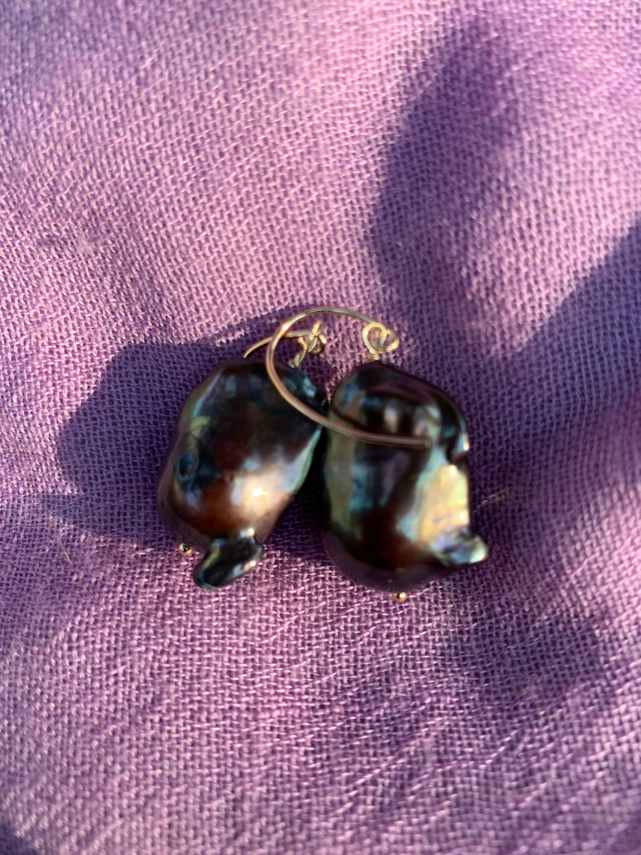These dangles are dark and fabulous. They have hints of purple and bronze, but are mostly a beautiful brown-black. The gold findings pick up the hints of colour, making them dramatic but easy to wear.